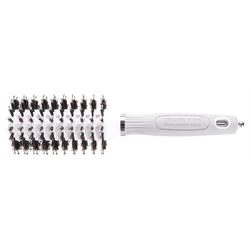 Technologie Tourmaline-IonLe procédé d'injection de tourmaline réduit l'électricité statique sur les cheveux. La cuticule de chaque cheveu sera refermée, évitant ainsi au cheveu de se dessécher. Les résultats visibles seront une brillance éclatante, des cheveux en meilleure santé et un meilleur résultat de coiffage. Les brosses ionisées offrent surtout une meilleure protection lors de séchages fréquents, ou lors de l'usage d'autres moyens basés sur l'utilisation de la chaleur.Mélange de poils en sanglier et poils en nylonLes poils de sanglier sont un produit naturel qui depuis des années est gage de qualité. Les poils 100% pur sanglier première coupe que nous utilisons pour nos brosses, lissent les cheveux pendant le brossage et leur donnent brillance et volume. Combinés à des poils en nylon, le cuir chevelu est stimulé tout en douceur.Poils en nylon antistatiques et chargés en ionsL'électricité statique du cheveu est un éternel problème du soin des cheveux. Les poils de la brosse étant intensivement en contact avec les cheveux, ils ont une importance décisive en la matière. Les poils en nylon ionisés et antistatiques, tels que ceux utilisés pour nos brosses préviennent efficacement la charge des cheveux en électricité statique, avec pour résultat des cheveux lisses et brillants. De plus, la cuticule des cheveux sera alors fermée, prévenant ainsi efficacement les cheveux du dessèchement.Poils 100 % sanglierLes poils de sanglier sont un produit naturel qui depuis des années est gage de qualité pour les brosses de haute qualité. Les poils 100% sanglier pur première coupe, que nous utilisons pour nos brosses, lissent les cheveux pendant le brossage et leur donnent brillance et volume.Barillet céramiqueLa revêtement en céramique des brosses Olivia Garden offre un avantage important: la céramique assure que la chaleur du sèche-cheveux soit mieux et plus rapidement répartie sur toute la surface de la brosse. De larges alvéoles de ventilation assurent une meilleure circulation de l'air. Le séchage est plus rapide, précis, et plus doux.Circulation d'air optimiséeLe séchage des cheveux devrait idéalement être rapide avec un résultat parfait, sans surchauffer ni dessécher les cheveux. Les larges alvéoles d'aération dans le barillet de nos brosses procurent une meilleure circulation de l'air. Résultats: un coiffage plus rapide et efficace.Anneau anti-accrocheSi nos brosses sont étudiées pour un confort et une prise en main parfaite, notre attention est aussi portée sur des détails pouvant paraître anodins. Il n'y a pas que les poils qui sont étudiés pour un démêlage plus facile et en douceur. L'anneau autour du barillet lui-même est conçu afin de prévenir et éviter que les cheveux ne s'y accrochent pas pendant le coiffage.Manche ergonomiquePour une bonne prise en main et un usage en toute sécurité, le manche de la brosse est très important. Il ne doit pas glisser pendant le coiffage des cheveux et doit parfaitement s'adapter à la main. Le manche ergonomique antidérapant assure un confort de travail maximum aux brosses Olivia Garden.Pic de section rétractablePour de nombreuses techniques de séchage et de coiffage, il est important de sectionner la chevelure. Le pic de section, inséré à la fin du manche de nos brosses, est parfait pour délimiter les sections dans la chevelure à coiffer. Un coiffage précis devient alors nettement plus facile.LégèretéLe poids est un facteur important lors du choix du matériel de coiffage idéal. Une brosse lourde peut rapidement devenir une contrainte pour le poignet, le bras ou l'épaule, et plus particulièrement lors de coiffures plus élaborées. Au plus la brosse sera légère, au plus son maniement sera confortable et facile. Nos brosses sont ultralégères et sont étudiées pour un coiffage sans fatigue et dans le respect des conditions d'ergonomie.