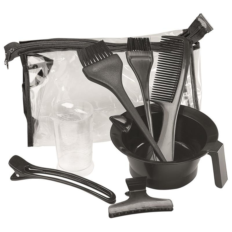 1 bol antidérapant (250 ml), 2 pinceaux, 2 pinces sépare-mèches, 1 peigne et une mesurette (100 cc) livrés dans une trousse transparente.
