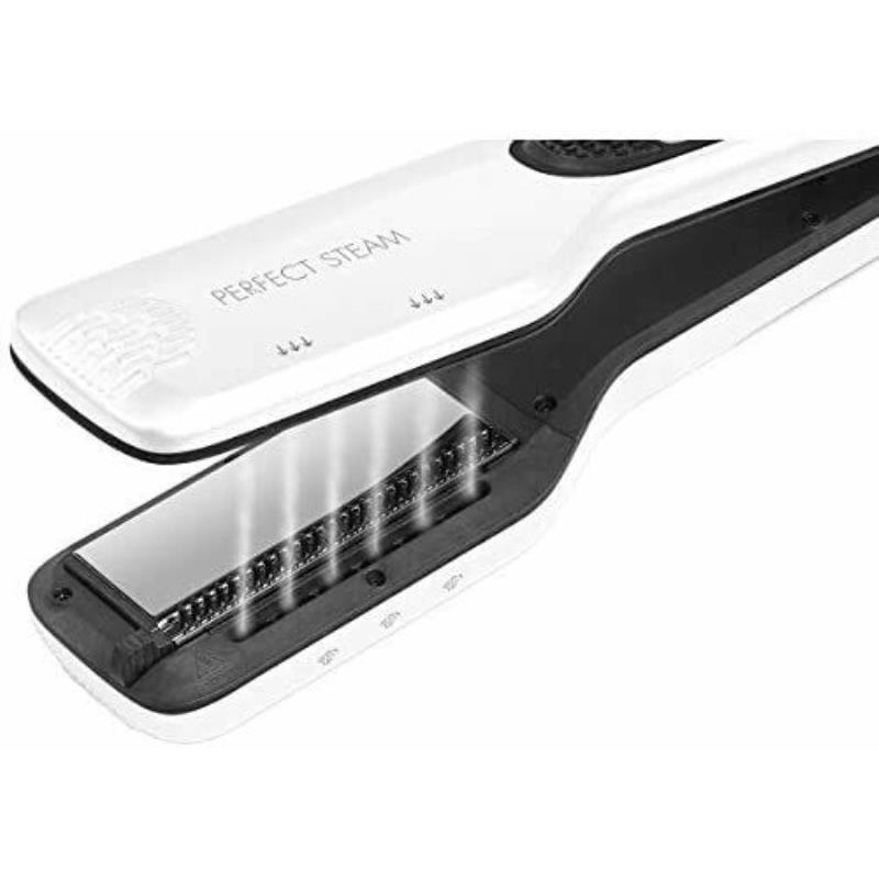 Lisseur Vapeur professionnel Perfect Steam Blanc avec réservoir d'eau intégréLe Lisseur Vapeur Perfect Steam hydrate les cheveux durant le coiffage.Il empêche les cheveux de se dessècher pendant le lissage.Plaques flottantes en Titane5 Niveaux de température de 150°C à 230°CPeigne fin amovible intégré entre les plaques ( la chevelure est peignée pendant le lissage )Interrupteur On/OffRés...