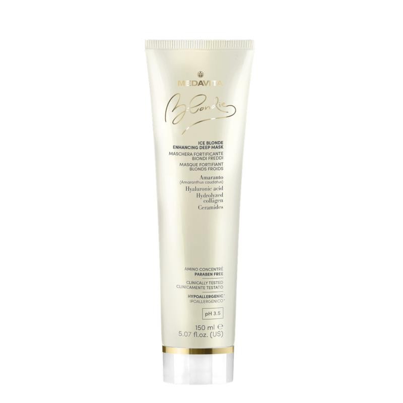 ICE BLONDEENHANCING DEEP MASKMasque raviveur de reflets pour cheveux blonds. Preserve et rehausse les reflets froids, en redonnant du corps a la structure. Contient du Collagene hydrolyse, reconstituant et conditionnant, de l’Acide hyaluronique, hydratant et elastifiant, et des proteines d’Amarante, hydratantes, protectrices et filmogenes ; un precieux complexe de Ceramides, dont l’actio...