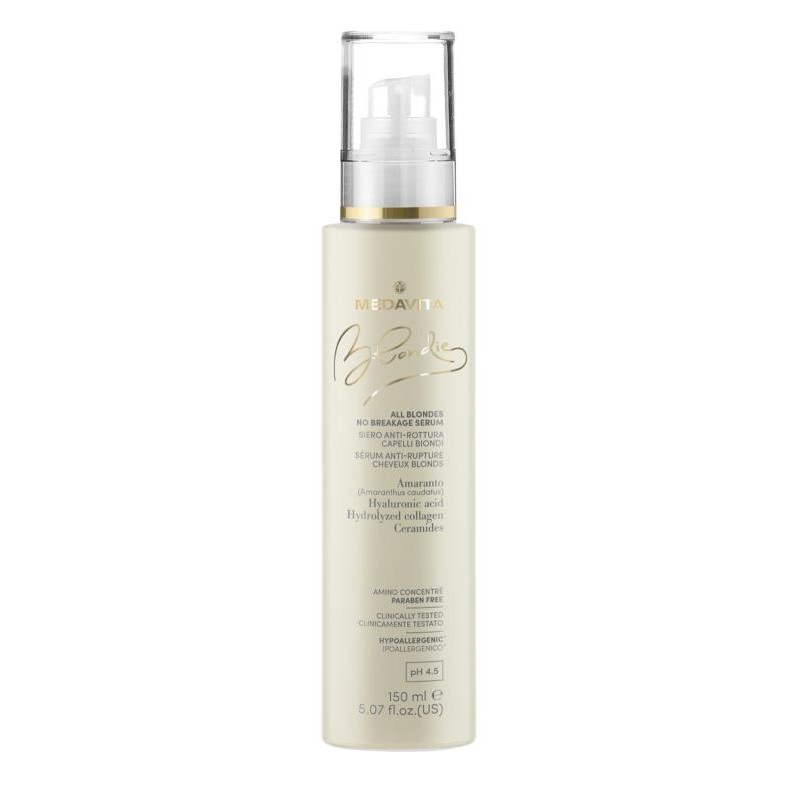 ALL BLONDESNO BREAKAGE SERUMSerum hydratant et repulpant. Rend les cheveux extremement faciles a coiffer, en reduisant le risque de rupture et en donnant du corps et de la structure a la fibre. Contient du Collagene hydrolyse, reconstituant et conditionnant, de l’Acide hyaluronique, hydratant et elastifiant, et des proteines d’Amarante, hydratantes, protectrices et filmogenes ; un precie...